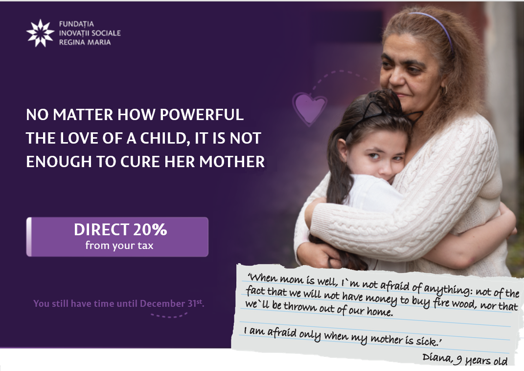 “ By directing 20% from your company’s income or profit tax we can offer medical services to these women and men, for whom health means another day won next to their children. Health is not guaranteed for anybody, especially not for those who do not have access to a medical service other than the emergency service. And when on these people depend thousands of children, the situation becomes even more dramatic”, states Cristiana Mateoiu, Executive Director of the Foundation.