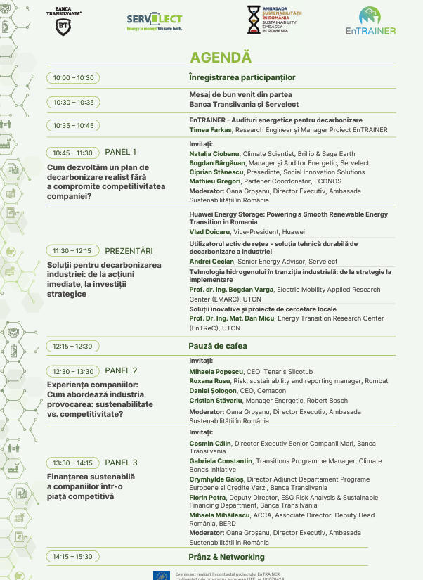 • Pentru jumătate de zi, evenimentul va reuni lideri din industrie, experți și profesioniști din domeniu, care vor explora provocările actuale și soluțiile disponibile pentru a menține competitivitatea companiilor în drumul către o tranziție sustenabilă.